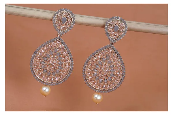 Grey Gold T1 Polki St1 Studded With Pearl Drop Dangler Earrings