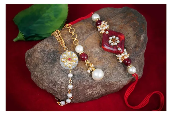 Handmade Kundan Red Stone Rakhi For Brother, Combo Kundan White Stone Coupl..More