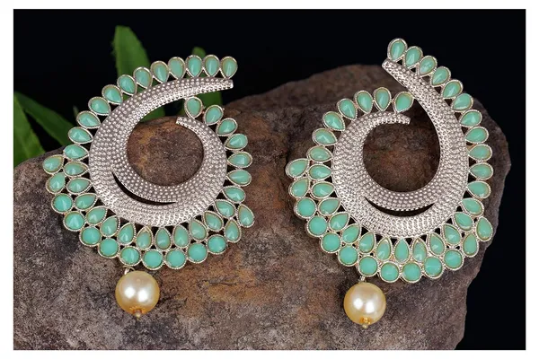 Latest Gold Tone Spiral Green Polki Stone Studded With Pearl Drop Earrings ..More