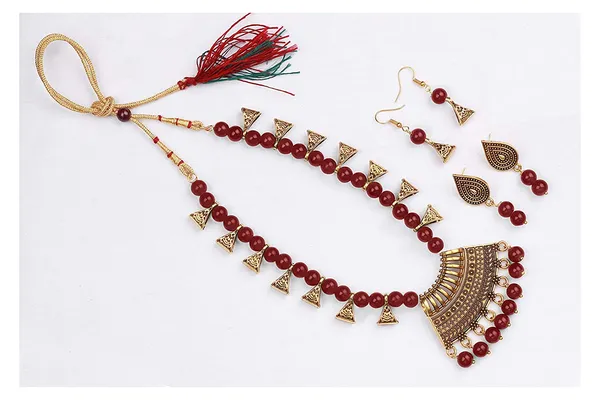 Maroon Gold German Silver Oxidized Combo Of 2 Earrings And Beaded Necklace ..More
