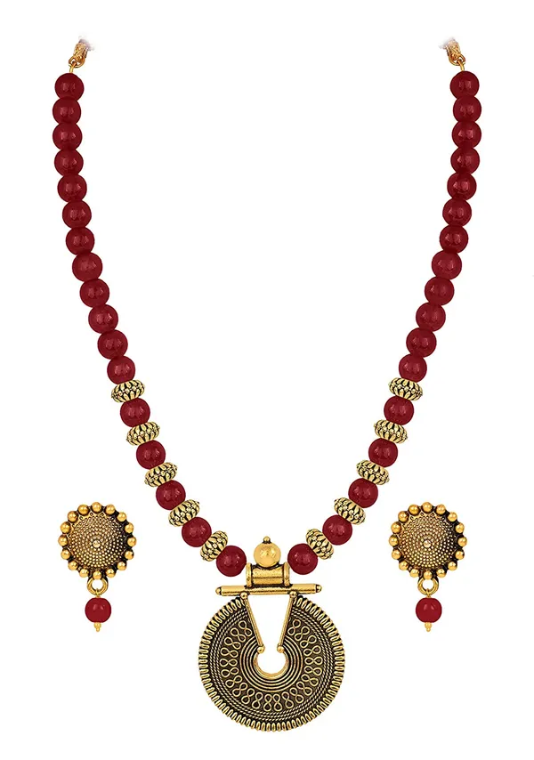 Maroon Gold Plated Beaded Necklace Set With Adjustable Thread