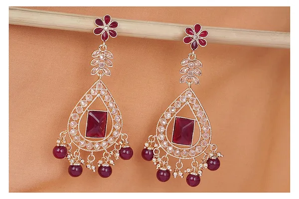 Maroon Gold T1 Floral Rectangle Crystal And Polki St1 Drop Shape Earring /G..More