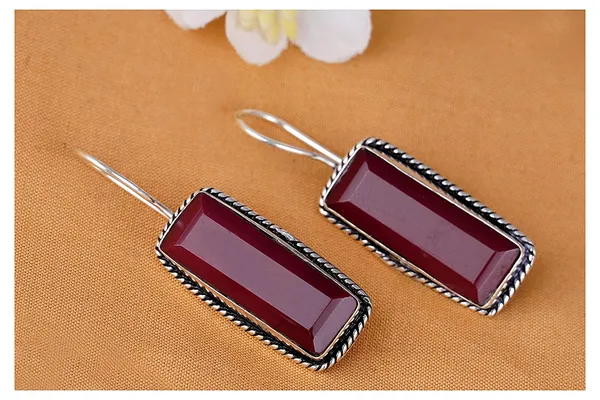 Maroon Oxidized Silver Plated Rectangle Shape Crystal Earrings