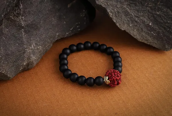 Matte Finish Black Onyx Stone With Panch Mukhi Rudraksha Stretchable Bracel..More