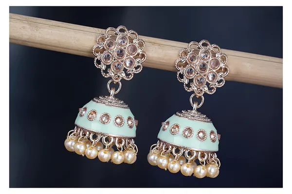 Mint Green Jewellery Pearl Enamel Meenakari Hand Painted Jhumka Earrings