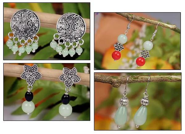 Mint Green,Red Oxidised Silver Plated Handmade Beaded Multi Dangler Earring