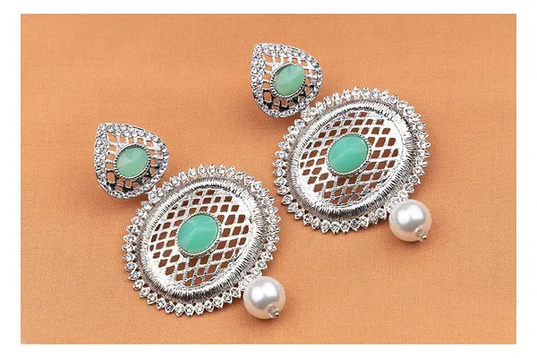 JFL - Jewellery for Less Silver Plated Oval Shape Cz Diamond Polki and Stone Studded Drop Pearl Dangler Earrings Women love jewellery specially Fashions jewellery adore a women You can wear this Earrings on all occasion This beautiful piece of jewellery will enhance your beauty and compliment you Make your moment memorable with this high quality fashion earrings This earrings women’s wear on like ring ceremony, wedding and any traditional festive time, daily wear,office wear This pretty earring pair makes your look impressive for any occasion It will make your moment memorable with this range This designed Earrings will go well matching With Any Attire Like dress,saree This Earrings will definitely be a treasured inclusion in every woman's jewellery collection new range of fashion earrings - Designer, Classy, Charming, Elegant, Appealing, Affordable, Casual as well as party wear, Pocket-friendly, Superb quality, High quality plating, Skin friendly, Non-allergic, Attractive, Mesmerising, etc