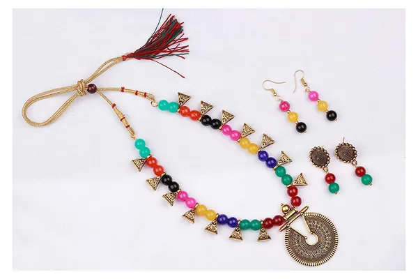 Multi Gold Oxidized Combo Of 2 Earrings And Beaded Necklace Set With Adjust..More