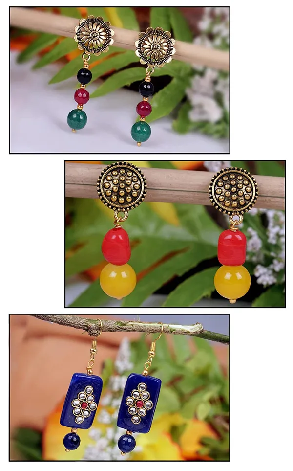 Multicolor Contemporary Oxidised Gold Plated Handmade Beaded Dangler Earrin..More