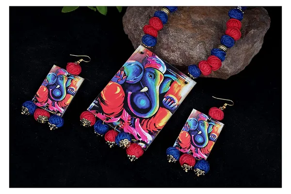 Navy Blue & Red Ganesha Necklace Set With Cotton Thread Bead With Adjustabl..More