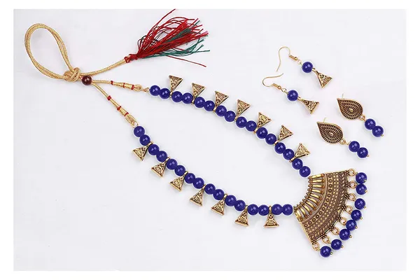 Navy Blue Gold German Silver Oxidized Combo Of 2 Earrings And Beaded Neckla..More
