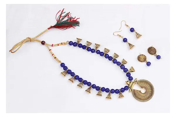 Navy Blue Gold Oxidized Combo Of 2 Earrings And Beaded Necklace Set With Ad..More