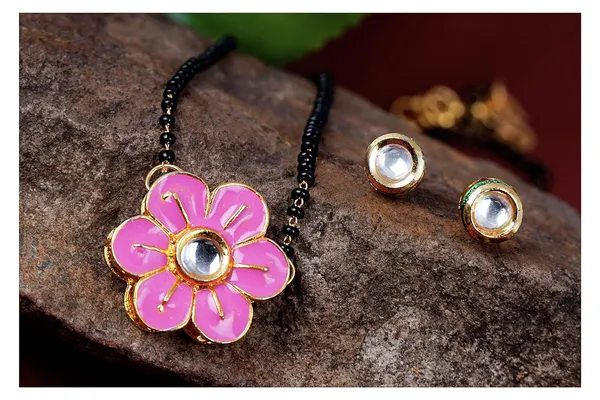 One Gram Gold Plated Kundan Meenakari Floral Pendant Mangalsutra With Kunda..More