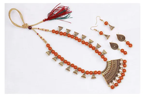 Orange Gold German Oxidized Onyx Beaded Necklace Set With Adjustable Thread