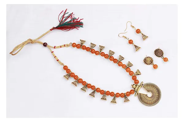 Orange Gold Oxidized Combo Of 2 Earrings And Beaded Necklace Set With Adjus..More