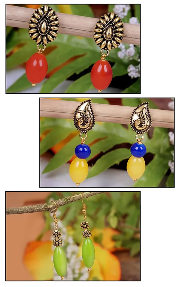 Orange,Yellow,Green Contemporary Oxidised Gold Plated Handmade Beaded Dangl..More