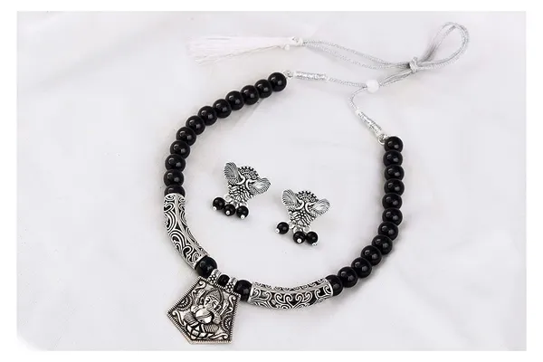 Oxidise Silver Plated Ganesha Pendant Onyx Beads Necklace And 1 Pair Of Ear..More