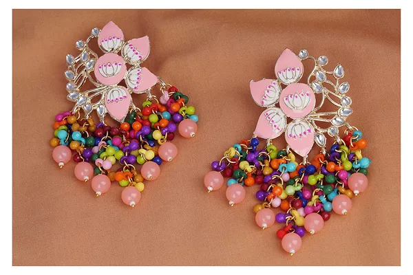Peach Contemporary Gold T1 Lotus Meenakari Floral Design White St1 Studded ..More