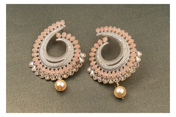 Peach Gold T1 Spiral Cz Diamond And Polki St1 Studded With Pearl Drop Earri..More