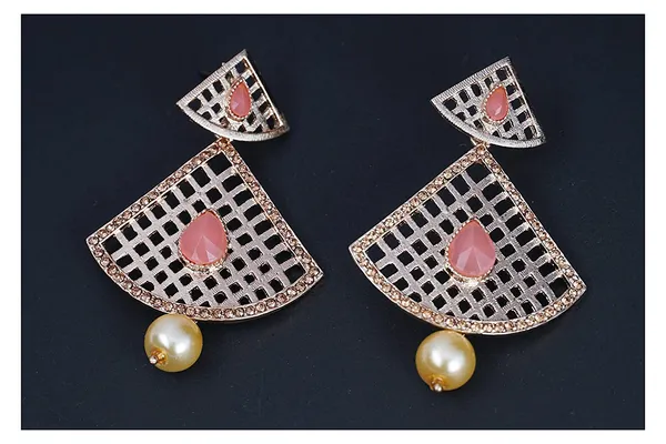 Peach Gold T1 Triangle Design Jali Work And Polki St1 Studded Pearl Drop Ea..More