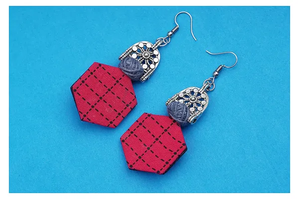 Pink & Black German Silver Oxidized Fabric Hexagon Pattern Dangler Earrings