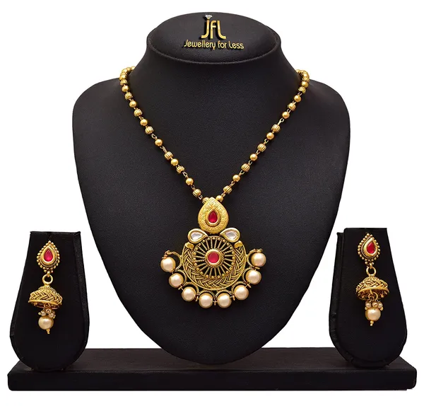 JFL - Traditional Ethnic One Gram Gold Plated Pearl Kundan Pink Designer Pandant Set with Earring & Girls