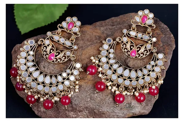 Pink Beautiful Chandbali Mirror Work Pearl Beads Hanging Earring