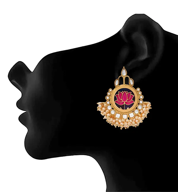 JJFL - Traditional Ethnic One Gram Gold Plated Meenakari Kundan & Pearl Designer Lotus Earring