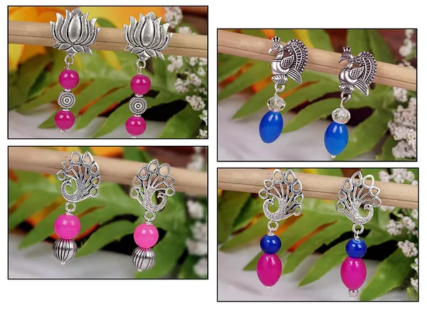 Pink,Blue,Baby Pink Oxidised Silver Plated Handmade Beaded Multi Dangler Ea..More