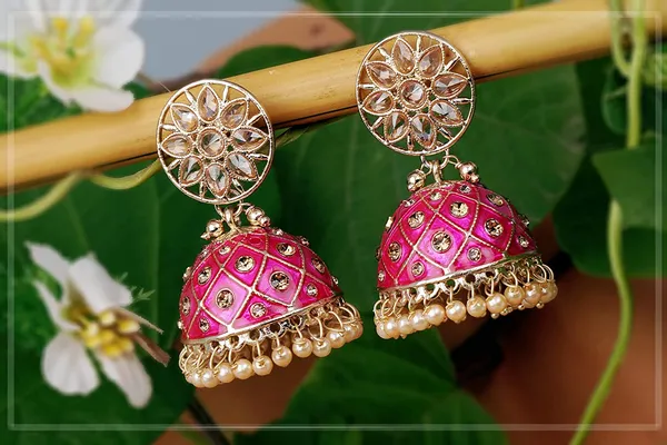 Pink Enamel Cz Polki St1 Pearl Hanging Jhumki Earrings Jewellery