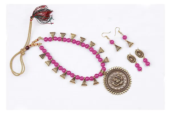 Pink Gajamukha Gold German Silver Oxidized Combo Of 2 Earrings And Beaded N..More
