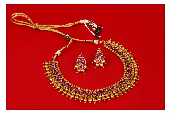 Pink Gold Plated St1 Studded Necklace Set With Adjustable Thread