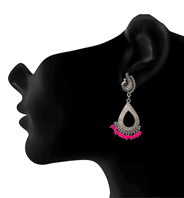 Pink Handmade German Silver Plated Oxidised Peacock Earring