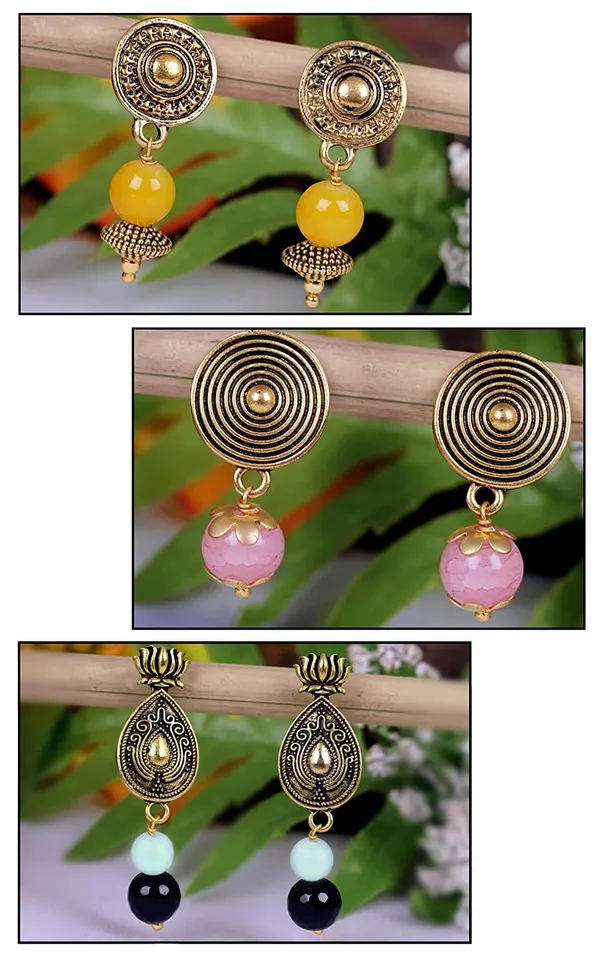 Pink,Yellow,Black Fancy Oxidised Gold Plated Handmade Beaded Dangler Earrin..More