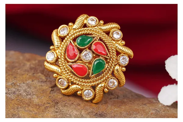 Red & Green Gold Plated & St1 Studded Adjustable Finger Ring