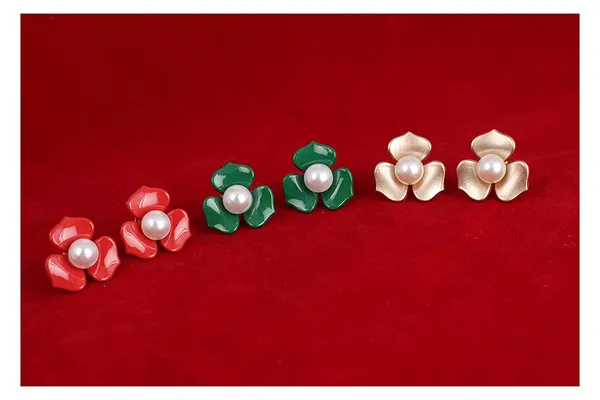 Red, Gold, Green Combo Of 3 Floral Pearl Stud Earrings