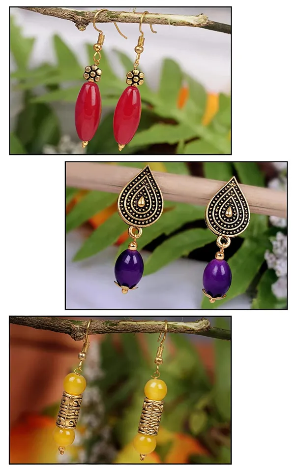 Red, Yellow, Purple Oxidised German Gold Plated Handmade Beaded Dangler Ear..More