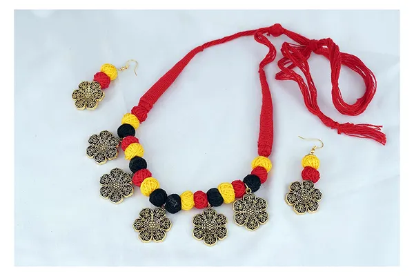 Red, Yellow Floral Gold German Silver Oxidized Cotton Beads With Cotton Adj..More