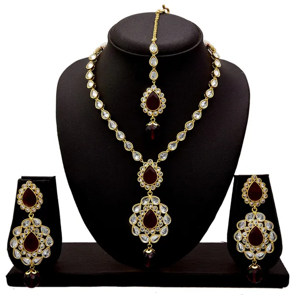 Red 1 Gm Gold Plated Cz American Diamond Necklace Set With Earring & Maang ..More