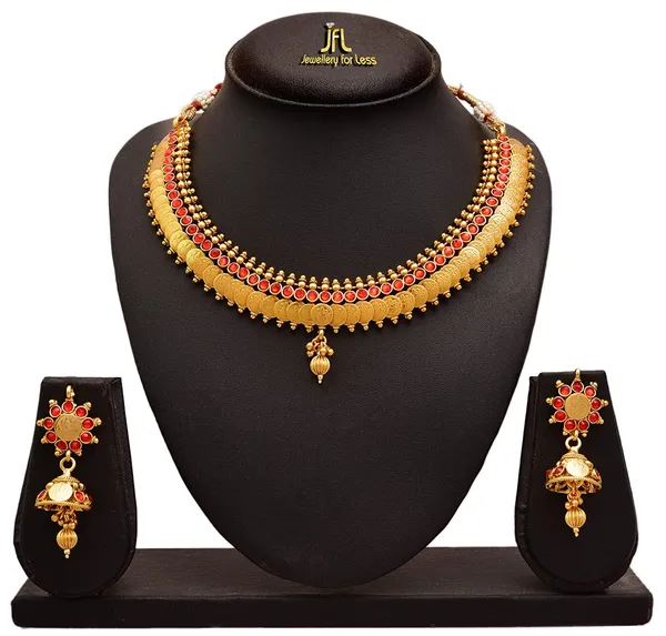 Red 1 Gm Gold Plated Temple Laxmi Goddess St1 Necklace Set With Jhumka Earr..More