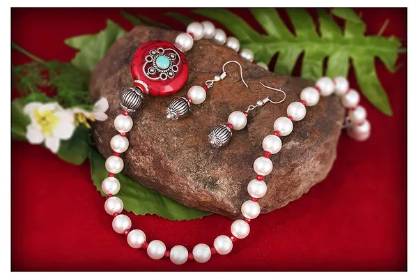 Red Fashionable Oxidise Silver Plated Pendant Small Bead & White Pearl Mala..More