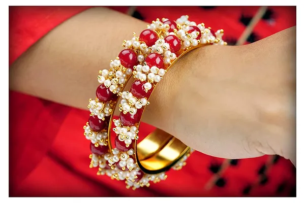 Red Gold Plated Cluster Pearl And Red Color Beads Bangle Set For Women And ..More