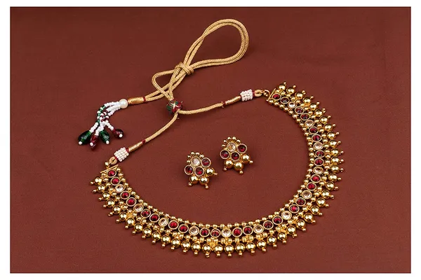 Red Gold Plated Cz American Diamond And St1 Studded Necklace Set With Adjus..More