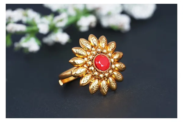 Red Gold Plated Floral St1 Studded Adjustable Finger Ring