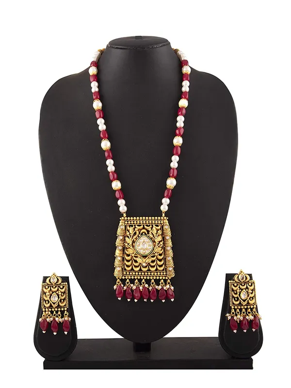 Red Gold Plated Necklace & Earrings Set With Pearl & Onyx St1 S