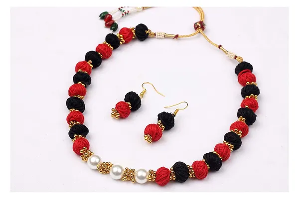 Red Gold Plated Pearl Cotton Beaded Choker Necklace Set With Adjustable Thr..More