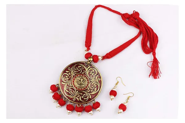 Red Gold Plated Unique Floral Ganesha Design Cotton Bead Necklace Set With ..More