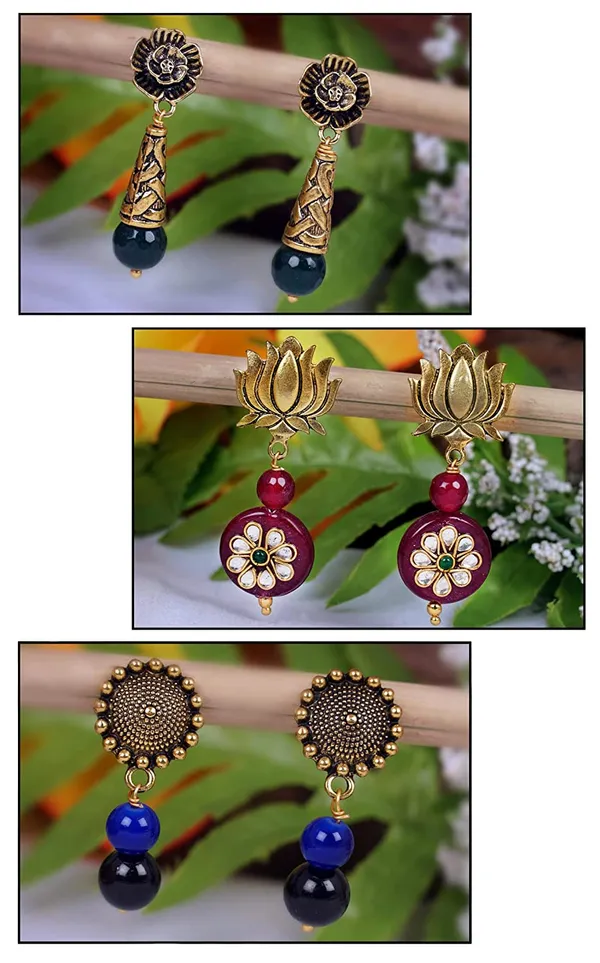 Red,Green,Black Floral Oxidised Gold Plated Handmade Beaded Dangler Earring