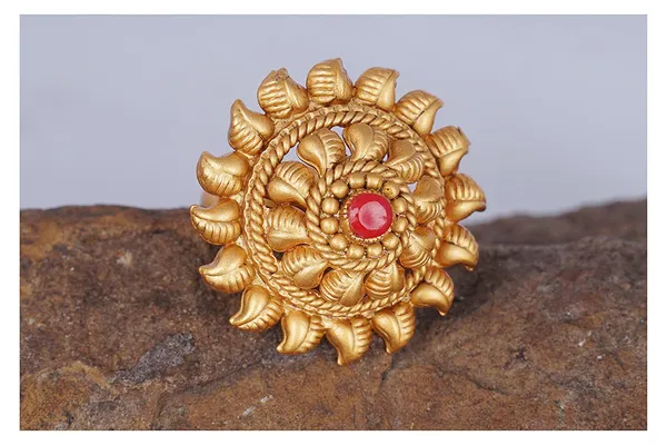 Red Matte Gold Plated Floral With St1 Leaf Design Adjustable Finger Ring