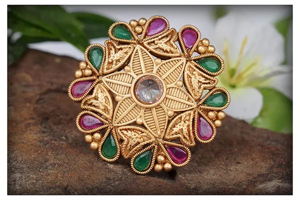 Ruby Red & Emerald Green Matte Gold Plated Floral Emerald & Ruby Adjustable..More